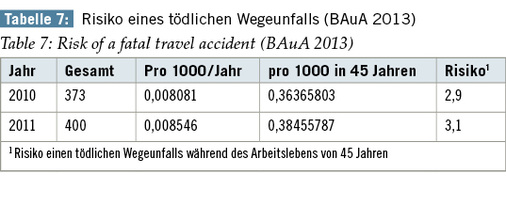 Analog der Arbeitsunfälle nimmt auch die Anzahl tödlicher Wege-unfälle von und zum Arbeitsplatz seit den 70er Jahren des letzten Jahrhunderts kontinuierlich ab und erreichte in 2010 mit 373 Toten einen historischen Tiefpunkt ( Tabelle 7 ). Das Risiko, innerhalb eines Arbeitslebens von 45 Jahren einen tödlichen Wegeunfall zu erleiden, war etwa halb so hoch wie das eines tödlichen Arbeitsunfalls in der sichersten Branche, der Gesundheit und Wohlfahrtspflege. Berücksichtigt man jedoch, dass die durchschnittliche Fahrtzeit zur Arbeitsstätte nur ca. eine Stunde pro Tag beträgt, so ist das Risiko im Vergleich mit der Arbeitszeit signifikant höher und mit dem Todesfallrisiko eines öffentlich Beschäftigten vergleichbar.