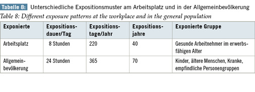 Als Zielwert für das Akzeptanzrisiko wurde 4 zu 100 000 festgelegt. Da dieser zurzeit für die überwiegenden Stoffe nicht mit vertretbarem technischem und wirtschaftlichem Aufwand erreichbar ist, wurde ein Zwischenschritt mit einem Akzeptanzrisiko von 4 zu 10 000 eingelegt. Das Risiko 4 zu 100 000 entspricht dem gleichen Risiko wie etwa 1 zu 1 Million für die Allgemeinbevölkerung unter der Annahme der gleichen Gesamtdosis unter Berücksichtigung der unterschiedlichen Expositionsdauern und exponierten Gruppen. Tabelle 8 zeigt die unterschiedlichen Expositionsparameter auf.