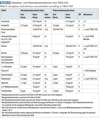 Nach Ausarbeitung der Expositions-Risiko-Beziehungen durch den Unterausschuss (UA) I, Beratung im AK-Risikokonzept des UA I und Verabschiedung durch den Ausschuss für Gefahrstoffe (AGS) wurden bisher die in Tabelle 9 aufgeführten Akzeptanz- und Toleranzkonzentrationen verabschiedet.
