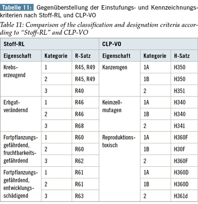 Mit der EG-Verordnung 1272/2008 zur „Einstufung, Kennzeichnung und Verpackung von Stoffen und Gemischen“, bekannt als CLP-Verordnung (Classification, Labelling, Packaging) wurde in der europäischen Union das von der UN festgelegte GHS-Kriterien (Globally Harmonized System) in europäisches Recht übernommen. In Anpassung an existierende internationale Einstufungssysteme wurden hierdurch die bisherigen Bezeichnungen der Einstufungskategorien der EG-Richtlinie 67/548/EWG geändert. In Tabelle 11 sind die bisherigen und die neuen Bezeichnungen gegenübergestellt. Wie der Tabelle unschwer zu entnehmen ist, ist bei den so genannten „Verdachtsstoffen“ eine Verwechslungsgefahr gegeben: Kategorie 2 nach der bisherigen Stoffrichtlinie bezeichnete Stoffe, die sich im Tierversuch als eindeutig kanzerogen, Keimzell-mutagen oder reproduktionstoxisch eingestuft wurden, während Kategorie 2 nach der CLP-Verordnung jetzt die Verdachtsstoffe beschreibt, die bisher als Kategorie 3 bezeichnet wurden.