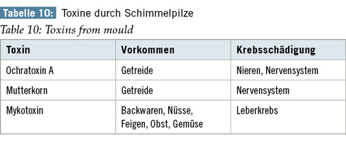 Als letztes Beispiel krebsauslösender Faktoren sollen die von Schimmelpilzen produzierten Toxine aufgeführt werden. Tabelle 10 listet die Toxine, ihr hauptsächliches Vorkommen sowie die durch sie ausgelösten Krebserkrankungen auf. Insbesondere die Mykotoxine – bekanntester Vertreter ist Aflatoxin – werden zunehmend für Krebserkrankungen verantwortlich gemacht. In Tierversuchen haben sie sich als extrem potente Kanzerogene erwiesen, die bereits in sehr niedrigen Mengen eine hohe Krebsinzidenz auszulösen vermögen. Durch feucht-warme Bedingungen wird ihre Vermehrung außerordentlich begünstigt.