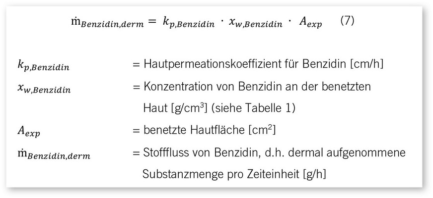 Gelangt eine Substanz auf die Haut, kann sie grundsätzlich auch in den Körper penetrieren. Kommt beispielsweise ein Spritzer einer Lösung mit gelöstem Benzidin auf die Haut – und wird dieser nicht direkt abgewaschen – kann die Diffusion der Substanz durch die Haut beginnen. Die Berechnung der dermalen Exposition erfolgt auf der Basis der Permeationsgleichung (Gleichung 7) (Eickmann 2008).