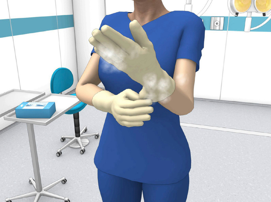 Fig. 2: Putting on powdered gloves