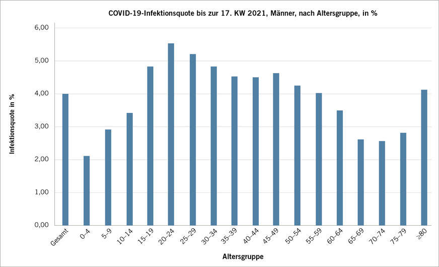 Bei Betrachtung der in der Studie relevanten Altersgruppen (20 bis 64 Jahre) errechnet sich eine Infektionsquote von 4,52 %. Für Männer errechnet sich aus der Tabelle 1 für diese Altersgruppen zusammen eine Infektionsquote (bekannte Fälle) von 3,4 % (Altersgruppen 20–64: Infektion bekannt: n = 114, Altersklassen 20 bis 64 insgesamt n = 3366).