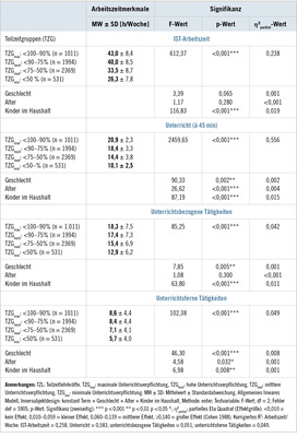 Durchschnittlich unterrichteten die TZL 17±5 Schulstunden/Woche (à 45 min), wobei die durchschnittliche vertragliche Unterrichtsverpflichtung in der TZGmax 21, in der TZGmin nur 10 Schulstunden/Woche (η2partial = 0,556, großer Effekt) betrug. Unterrichtsbezogene Tätigkeiten beanspruchten bei TZL durchschnittlich 16 Stunden/Woche (η2partial = 0,042, kleiner Effekt), unterrichtsferne Tätigkeiten 8 Stunden/Woche (η2partial = 0,049, kleiner Effekt). Geschlecht und Alter hatten auf die unterrichts- und arbeitszeitbezogenen Merkmale keinen praktisch bedeutsamen Effekt (η²partial < 0,010), Kinder im Haushalt einen kleinen Effekt (η²partial = 0,010–0,059; Ausnahme: unterrichtsferne Tätigkeiten: η²partial =0,001, kein Effekt).