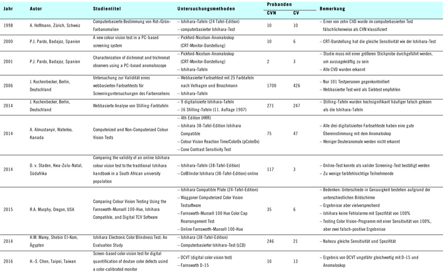 Die folgende Tabelle zeigt eine Übersicht der Studien zu digitalisierten Farbsehtestung.