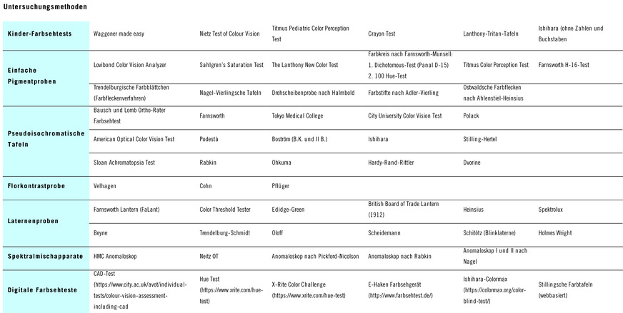 Das Farbsehen wird von Augen- und Betriebsärztinnen und -ärzten getestet. Dabei kommen pseudoisochromatische Tafeln, Farblegetests, Signallaternen und das Anomaloskop zum Einsatz. Bei pseudoisochromatischen Tafeln kommt es auf die Anzahl der Fehler, bei Farblegetests auf die Reihenfolge und bei Anpassungstests wie dem Anomaloskop auf die Lichtmischung an. Folgend werden die Testverfahren kurz beschrieben sowie der Farbsehtest im Optovist II der Vistec AG. Allerdings wird nicht näher auf die Untersuchungsbedingungen eingegangen. Dazu sei auf den Titel von Krastel et al. (2009) verwiesen.