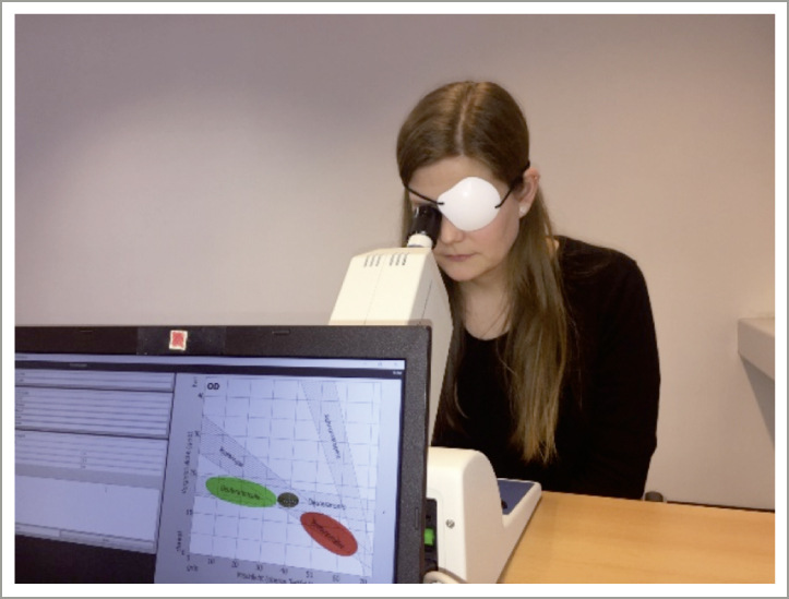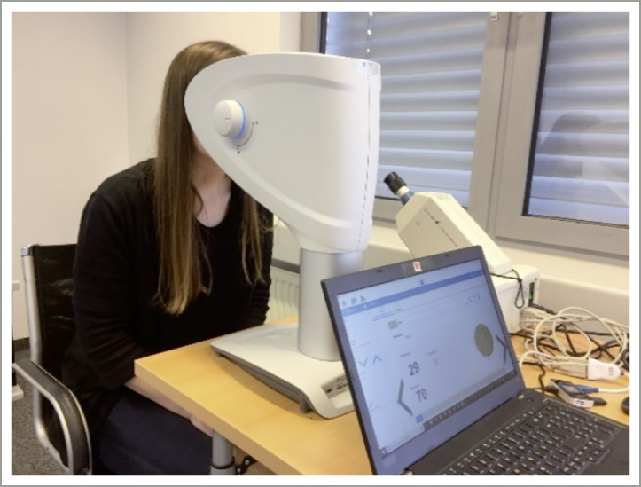 Fig. 3: Test subject in front of the Optovist II with the display in the Vistec app on the PC