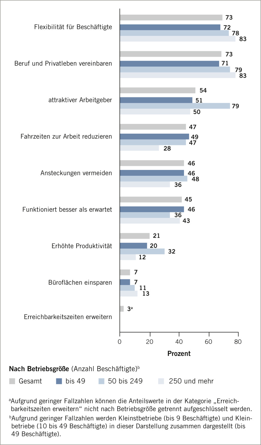 Stark arbeitgeberorientierte Vorteile, wie beispielsweise der Ausbau von Erreichbarkeitszeiten oder die Einsparung von Büroflächen, werden nur sehr selten genannt. Es wird deutlich, dass diese Aspekte primär mit der wahrgenommenen gesteigerten Produktivität assoziiert sind. In anderen Befragungen ist die Ausweitung der Erreichbarkeit durch mobiles Arbeiten deutlich häufiger genannt worden (Grunau et al. 2019). Vermutlich sehen die Betriebe aber gerade während der SARS-CoV-2-Pandemie die deutlich mehr Vorteile für Beschäftigte. Die Einsparung von Büroflächen wird ähnlich häufig genannt wie auch vor der Krise (Grunau et al. 2019). Aktuelle Befunde zeigen zudem, dass die Unternehmen bislang keine Einsparung an Büroflächen anstreben (Stettes u. Voigtländer 2021).
