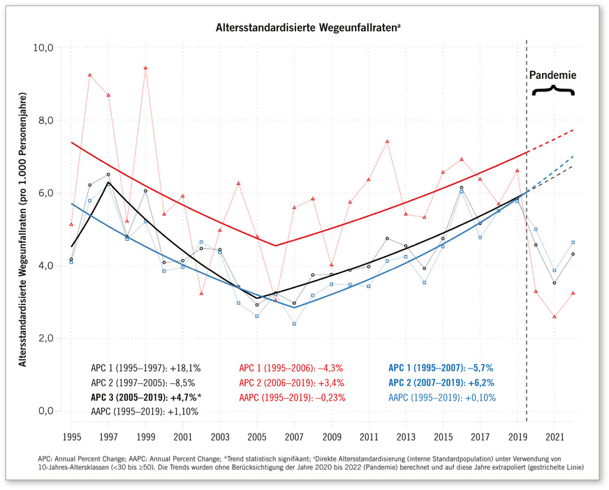 Nach einem anfänglichen kurzen Anstieg in den Wegeunfallraten (dicke schwarze Linie in ➥ Abb. 1) zwischen 1995 und 1997 zeigt sich ein deutlicher Rückgang in den Jahren 1997 bis 2005 und danach wiederum ein Anstieg (u-förmiger Verlauf). Ohne Berücksichtigung der SARS-CoV-2-Pandemie (2020–2022) war die altersstandardisierte Wegeunfallrate in den Jahren 2005 und 2007 mit jeweils 2,9 beziehungsweise 3,0 Wegeunfällen pro 1.000 Personenjahren am niedrigsten und im Jahr 1997 mit 6,5 am höchsten. In den Jahren der Pandemie (rechts der vertikalen gestrichelten Linie) lagen die beobachteten Wegeunfallraten bei beiden Geschlechtern recht deutlich unter den erwarteten Fällen, wenn der steigende Trend von 2005 bis 2019 auf die Pandemiejahre extrapoliert wird (gestrichelte Trendlinien). Die durchschnittliche jährliche prozentuale Veränderung (AAPC) über den Zeitraum 1995–2019 fiel mit +1,1 % (altersstandardisiert) gering aus und war statistisch nicht signifikant. Mit Ausnahme des Zeitraums der SARS-CoV-2-Pandemie, liegen die Wegeunfallraten der Frauen fast durchgängig über derjenigen der Männer.