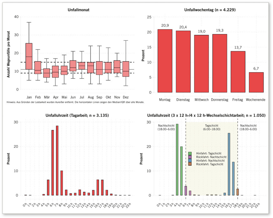 Im Hinblick auf den Wochentag, sind die Wegeunfälle zwischen Montag und Donnerstag relativ gleichverteilt, mit einem deutlichen Rückgang am Freitag (13,7 %) und am Wochenende (6,7 %). Bei Tagarbeitenden zeigt sich bezüglich der Unfalluhrzeit (s. Abb. 2, links unten) eine bimodale Verteilung, mit Peaks zwischen 6:00 und 7:59 Uhr (Hinfahrt) sowie, in deutlich geringerem Ausmaß, von 16:00–17:59 Uhr (Rückfahrt). Bei den Beschäftigten in Wechselschicht wiederum treten die meisten Wegeunfälle auf der Hinfahrt zur Tagschicht zwischen 4:00 und 5:59 Uhr auf, sowie auf der Hinfahrt zur Nachtschicht (zwischen 16:00 und 17:59 Uhr). Auffällig ist, dass die relative Häufigkeit von Wegeunfällen bei beiden Berufsgruppen auf der Hinfahrt zur Arbeitsstätte deutlich höher ist als auf der Rückfahrt.