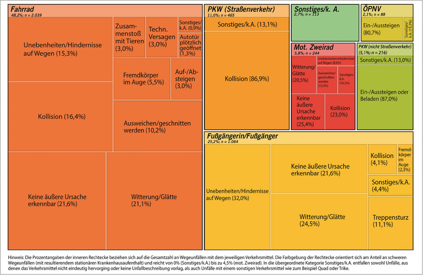 Unfallursachen nach Fortbewegungsmittel visualisieren die farblich nach Unfallursache getrennten inneren Rechtecke in Abb. 3. So lässt sich beispielsweise jeder fünfte Fahrradunfall und jeder vierte Unfall als Fußgänger auf Witterung/Glätte zurückführen.