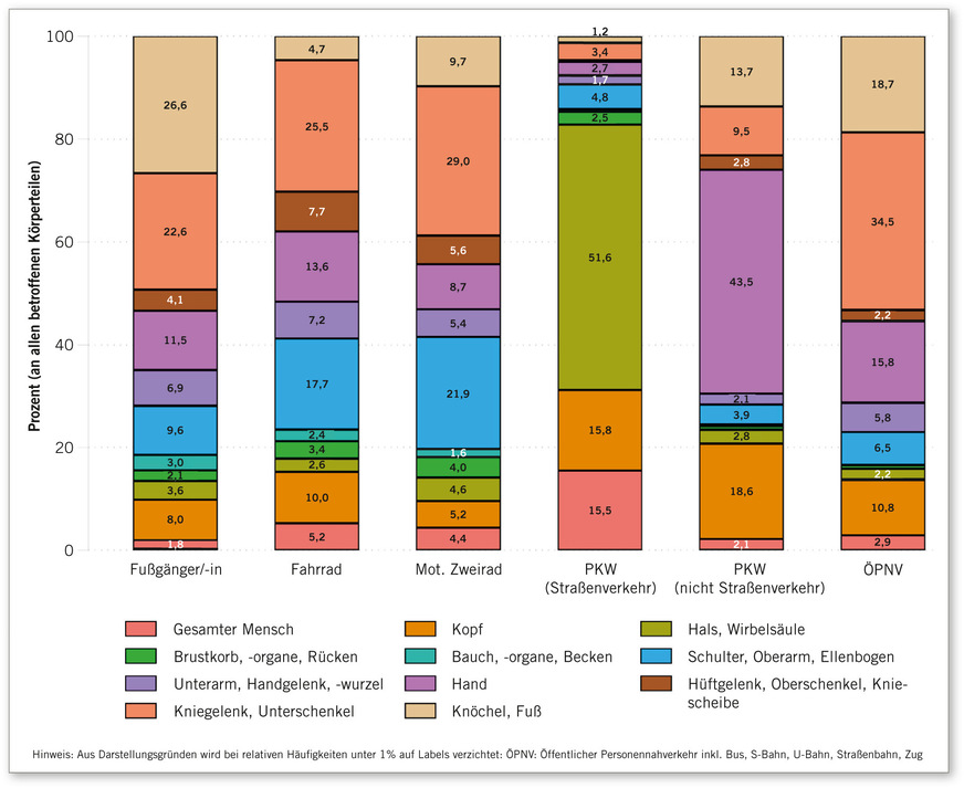 Bei den 4.229 Wegeunfällen wurden insgesamt 7.257 verletzte Körperteile erfasst und verschlüsselt, davon am häufigsten das Kniegelenk/Unterschenkel (22,7 %), Schulter/Oberarm/Ellenbogen (14,2 %), Hand (13,0 %), Knöchel/Fuß (10,5 %) sowie Kopf (10,1 %). Eine Stratifikation der verletzten Körperteile nach Verkehrsmittel zum Zeitpunkt des Wegeunfalls (➥ Abb. 4) zeigt eine vergleichbare Verteilung bei Unfällen mit dem Fahrrad und solchen mit einem motorisierten Zweirad (jeweils Kniegelenk und Unterschenkel als häufigste verletzte Körperteile, gefolgt von Schulter, Oberarm und Ellenbogen). Bei Unfällen als Fußgängerin/Fußgänger waren Knöchel, Fuß sowie Kniegelenk und Unterschenkel am häufigsten betroffen, bei Unfällen mit dem PKW im Straßenverkehr wiederum Hals und Wirbelsäule (ca. 50 %) gefolgt von Kopf und gesamtem Mensch (jeweils etwa 16 %).